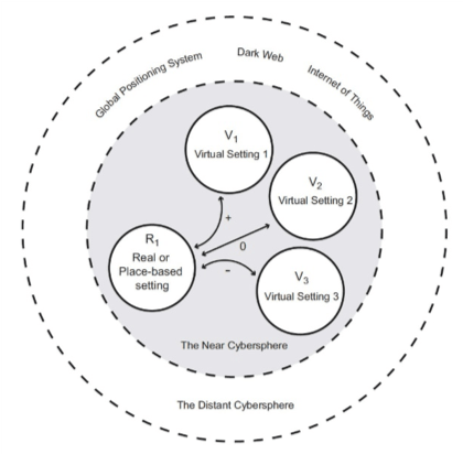 New concepts and metrics for assessing individuals’ cumulative exposure to their virtual surroundings are shown in Figure 2. The near-cybersphere (situated in the inner circle of the diagram) consists of all the connections between a physical place (e.g., a bedroom, classroom, or office) and the various digital transactions that occur there. The links between physical places, on the one hand, and a person’s digital spaces, on the other, are referred to as real-virtual (R-V) environmental units. Connections between between real and virtual environments may be mutually complementary, neutral, or conflicted as depicted by the virtual settings in Figure 2 (V1, V2, and V3) that are linked to a real place-based environment (R1). Complementary R-V units exist when one’s place-based and virtual activities are well-aligned and mutually supportive (e.g., using online resources in a classroom setting to illustrate key points covered in lecture). In contrast, conflicted R-V units are where the activities in the real and virtual settings interfere with each other (e.g., checking social media or texting while driving a vehicle). In neutral R-V units, the place-based and virtual activities neither support nor contradict each other.