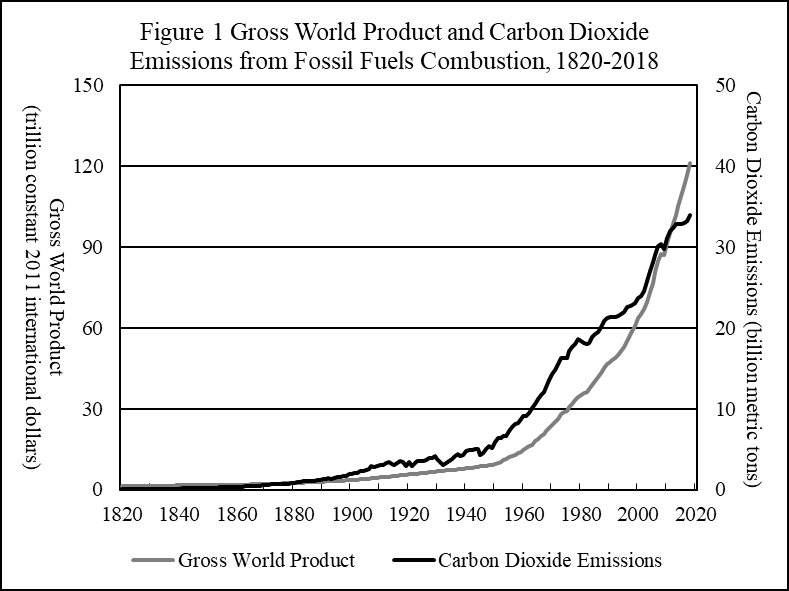 Historically, world economic growth has been closely correlated with carbon dioxide \ emissions. From 1870 to 2018, gross world product grew from 1.9 trillion dollars to 121 trillion dollars or by 62.4 times; during the same period, world carbon dioxide emissions grew from about 540 million metric tons to 33.9 billion metric tons or by 62.9 times. Although emissions growth has slowed in recent years, the emission levels are now far above what are absorbed by oceans and terrestrial ecological systems and about one-half of the annual emissions ends up in the atmosphere (Hansen 2019, Figure 16).