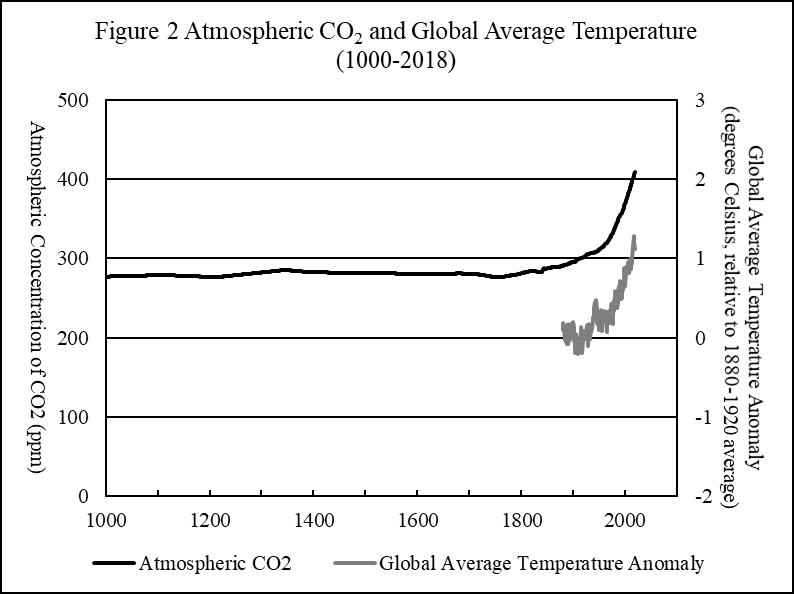 Sources: Atmospheric concentration of carbon dioxide from AD 1000 to 1958 is from EPI (2015). Atmospheric concentration of carbon dioxide from 1959 to 2018 is from NOAA (2019b). Global average temperature anomaly from 1880 to 2018 is from NASA (2019).