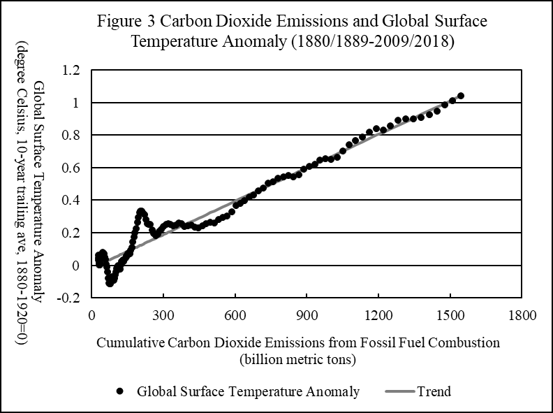 Sources: World carbon dioxide emissions from fossil fuels combustion from 1750 to 1964 is from Boden, Marland, and Andres (2017). World carbon dioxide emissions from fossil fuels combustion from 1965 to 2018 is from BP (2019). Global average temperature anomaly from 1880 to 2018 is from NASA (2019). In Figure 3, the linear trend fits the historical observations very well (regression R-square is 0.94). The linear trend implies that for each increase in cumulative carbon dioxide emissions by one trillion metric tons, global average temperature tends to rise by 0.68 degrees Celsius.