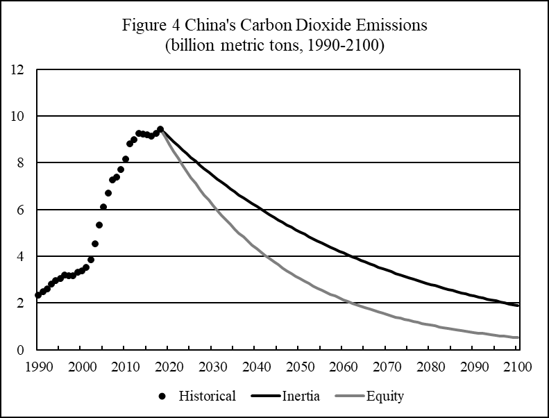 Under the inertia principle, China’s carbon dioxide emissions should begin to decline in 2019 and decline at a uniform annual rate of 1.85 percent in order to stay within China’s emissions budget of 392 billion metric tons; by 2050, China’s emissions should fall by 45 percent from the 2018 level and by 2100, China’s emissions should fall by 78 percent. Under the equity principle, China’s carbon dioxide emissions should begin to decline in 2019 and decline at a uniform annual rate of 3.31 percent in order to stay within China’s emissions budget of 258 billion metric tons; by 2050, China’s emissions should fall by 66 percent from the 2018 level and by 2100, China’s emissions should fall by 94 percent.