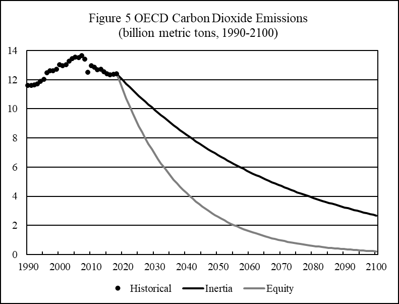 Under the inertia principle, OECD’s carbon dioxide emissions should begin to decline in 2019 and decline at a uniform annual rate of 1.85 percent in order to stay within OECD’s emissions budget of 516 billion metric tons; by 2050, OECD’s total emissions should fall by 45 percent from the 2018 level and by 2100, total emissions should fall by 78 percent. Under the equity principle, OECD’s carbon dioxide emissions should begin to decline in 2019 and decline at a uniform annual rate of 4.78 percent in order to stay within OECD’s emissions budget of 243 billion metric tons; by 2050, OECD’s total emissions should fall by 79 percent from the 2018 level and by 2100, total emissions should fall by 98 percent.