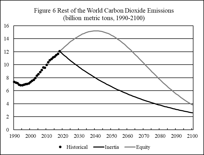 Under the inertia principle, the rest of the world’s carbon dioxide emissions should begin to decline in 2019 and decline at a uniform annual rate of 1.85 percent in order to stay within the rest of the world’s emissions budget of 502 billion metric tons; by 2050, the rest of the world’s total emissions should fall by 45 percent from the 2018 level and by 2100, total emissions should fall by 78 percent. If the rest of the world were to maintain its historical decline rate of emissions intensity of GDP (1.8 percent), then the rest of the world’s total economic output needs to decline by 0.05 percent each year to be consistent with the inertia principle. As the rest of the world’s population continues to grow by 1.4 percent a year and many countries have population growth rates greater than 2 percent, the inertia principle would be absolutely unacceptable by the rest of the world.