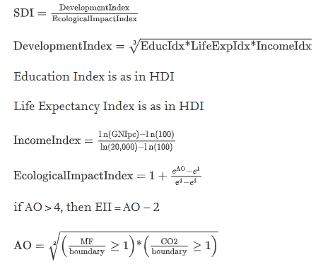 The Sustainable Development Index proposed here includes five indicators, then: education, life expectancy, income, CO2 emissions and material footprint. The SDI is calculated as the quotient of two figures: (1) a “development index” calculated as the geometric mean of the education index, the life expectancy index, and the modified income index; and (2) an “ecological impact index” calculated as the average overshoot of CO2 emissions and material footprint vis-à-vis their per capita planetary boundaries, indexed on a natural exponential scale. The formula can be described as follows: