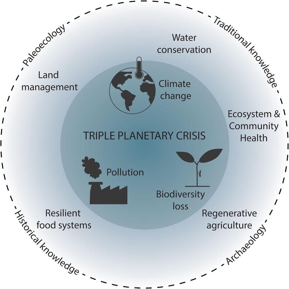 Figure 1. Schematic representation of the Triple Planetary Crisis (inner circle); connections to COP28 declarations and outcomes (middle circle); and suggested integration of key perspectives in policy making through the lenses of Paleoecology, Archaeology and Traditional and Historical knowledge (outer circle).