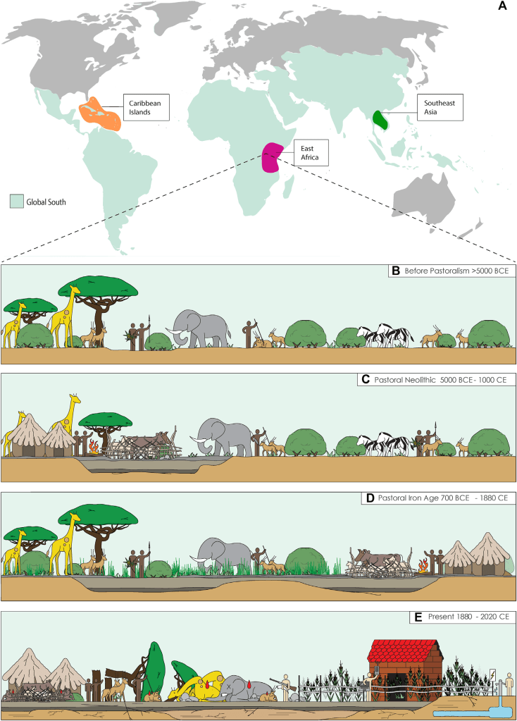 Figure 2. World map of featured case study sites situated in the Global South (A) with a focus of Pastoralism in eastern Africa: (B) Pre-pastoralism period dominated by patchy grass and shrublands, and sustainable hunting and gathering, (C) Onset of dung accumulation by incoming pastoralists and coexistence with hunters and gatherers, (D) Continuous accumulation of dung adjacent to past settlement sites and development of grassy glades, and (E) Pastoralists, hunters and gatherers, and wildlife facing calamities as a result of marginalization by modern land management strategies.